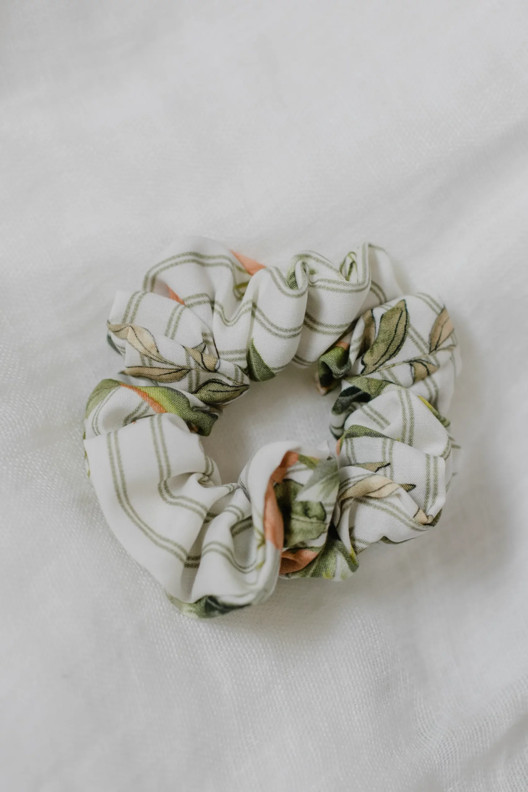 Wiskozowa gumka scrunchie w japońskie kwiaty i zielone pasy na białym tle – ta sama tkanina co koszula Natasha i spodnie Nadia