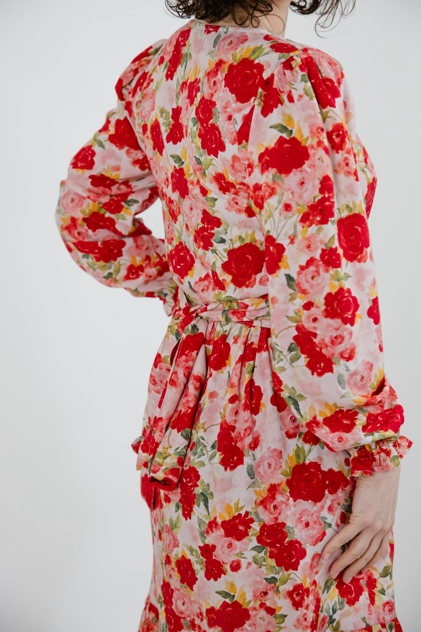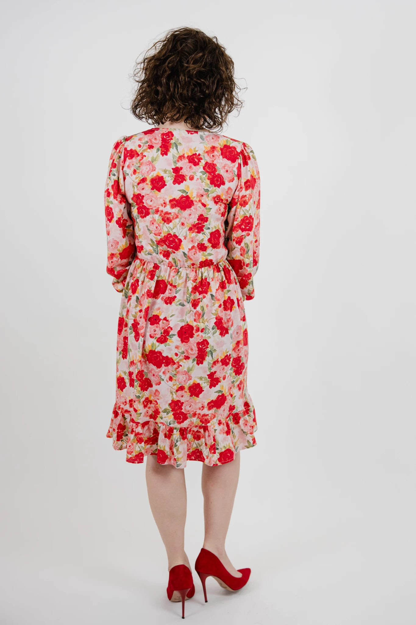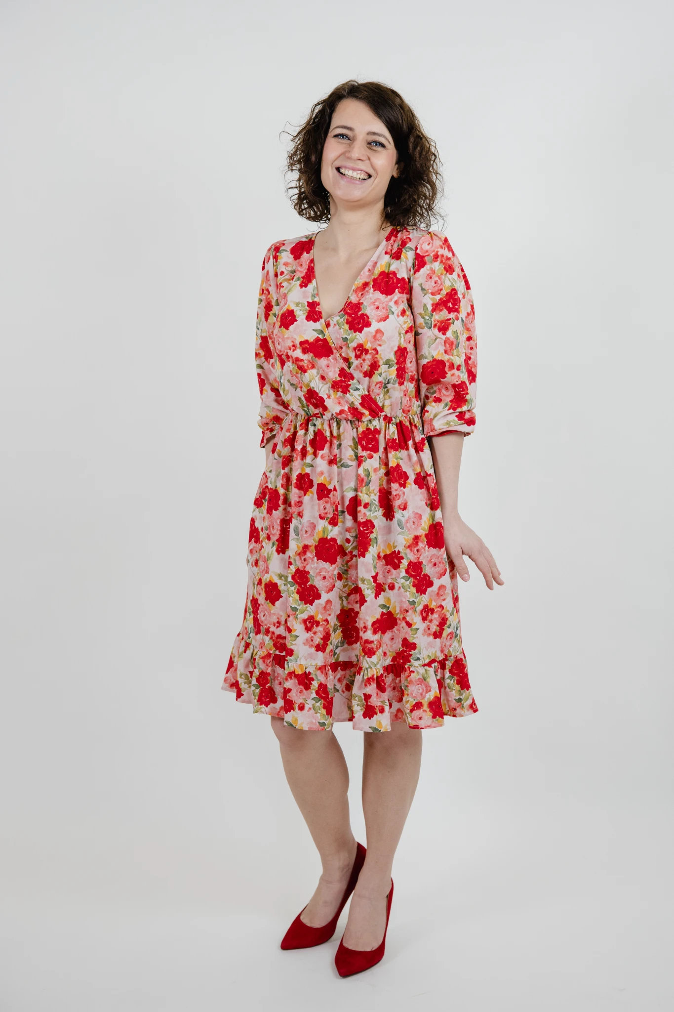 Sukienka uszyta jest z wysokiej jakości wiskozy we wzór czerwonych róż.
