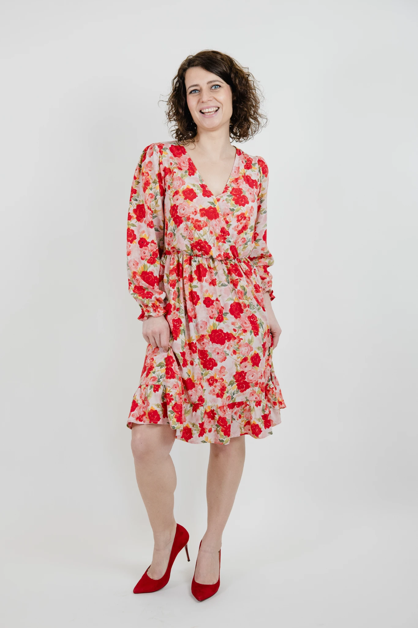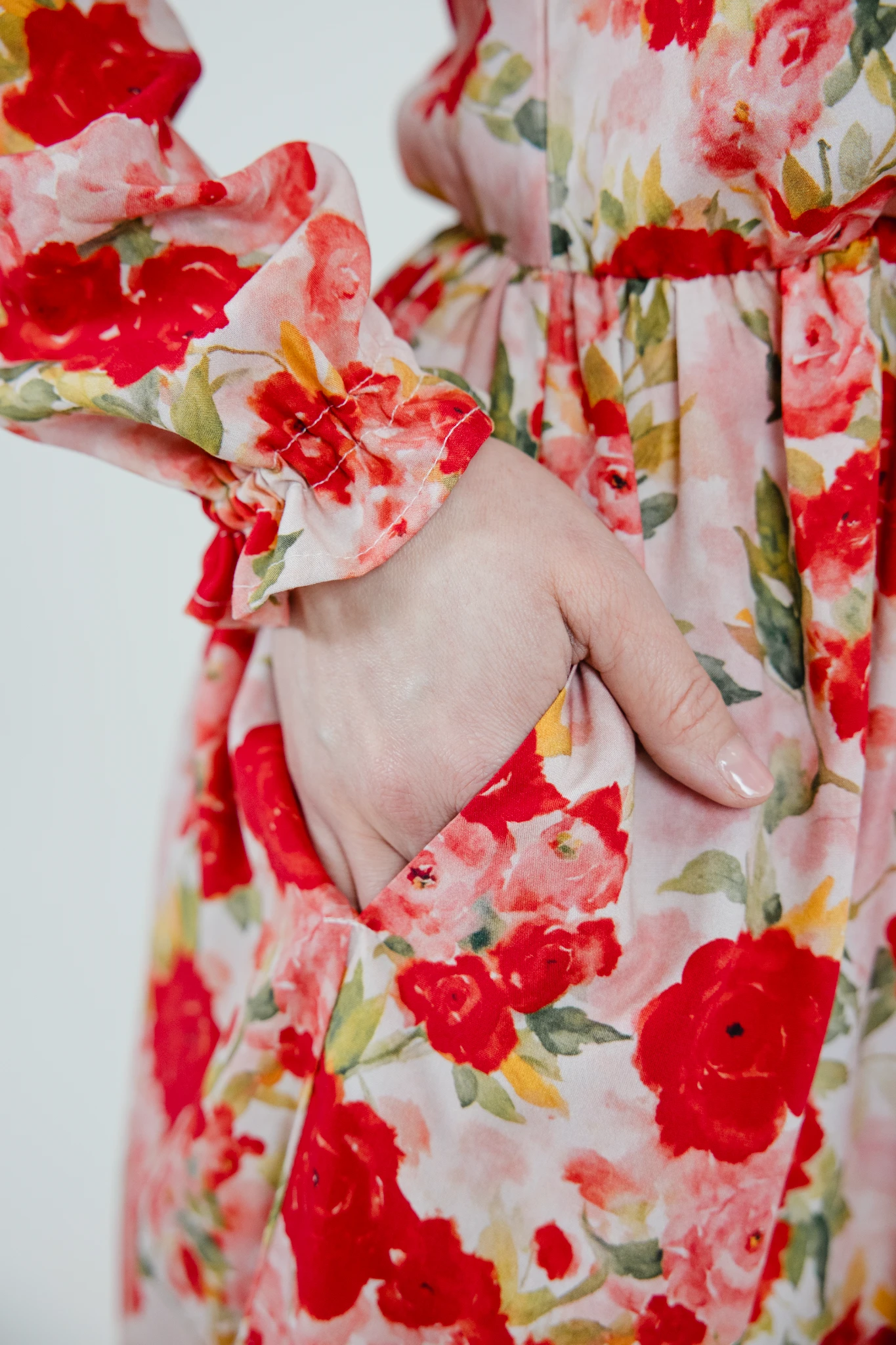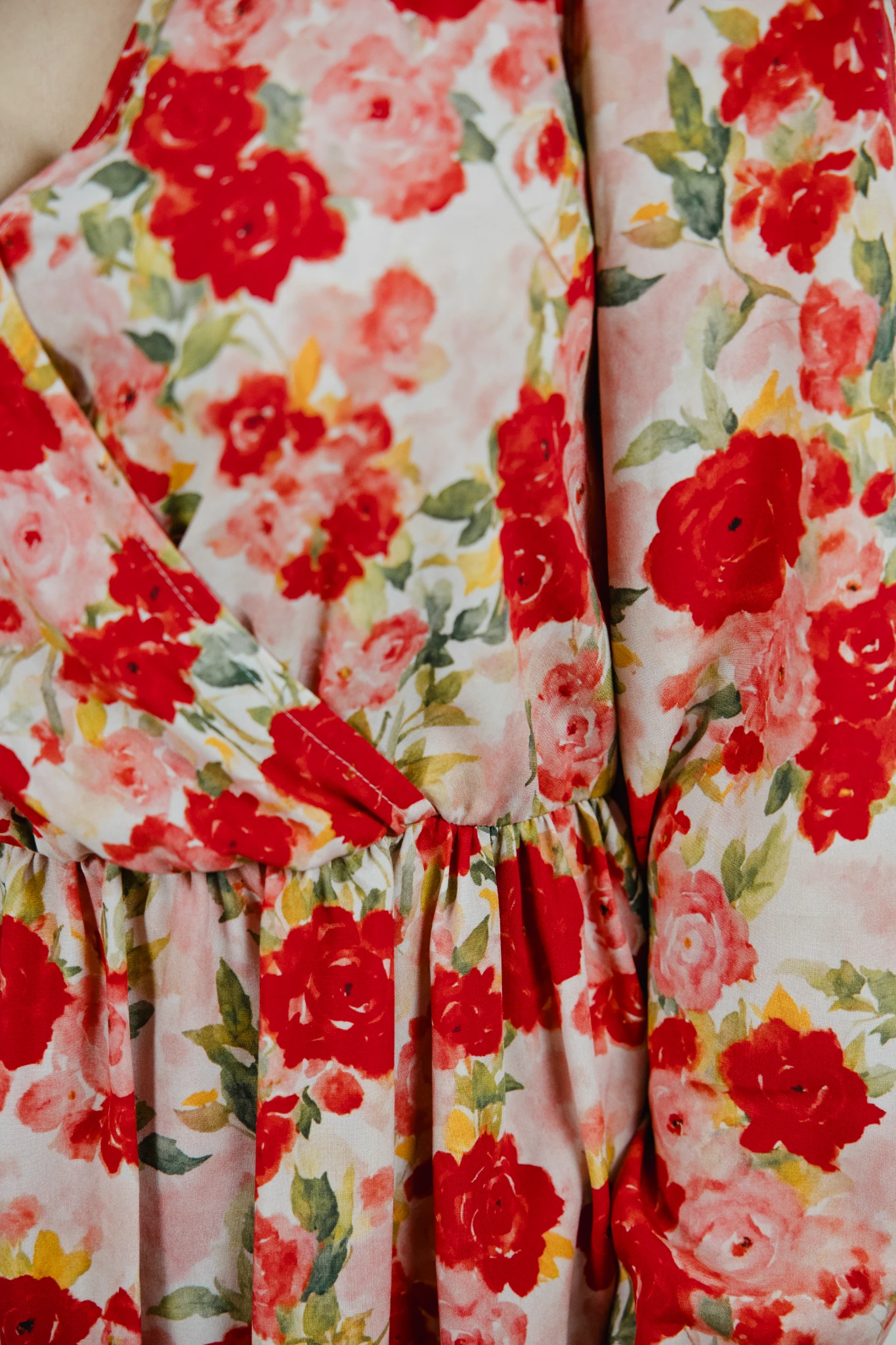 Sukienka uszyta jest z wysokiej jakości wiskozy we wzór czerwonych róż.