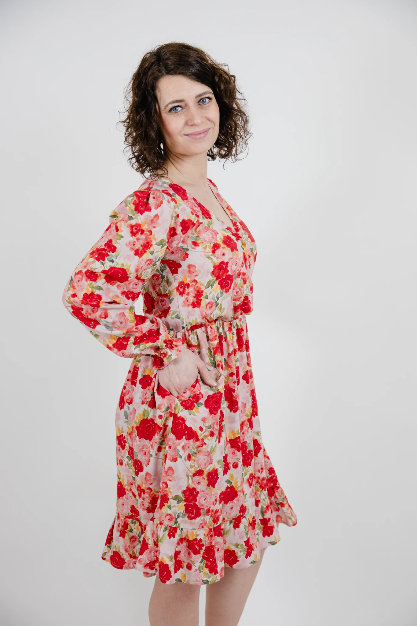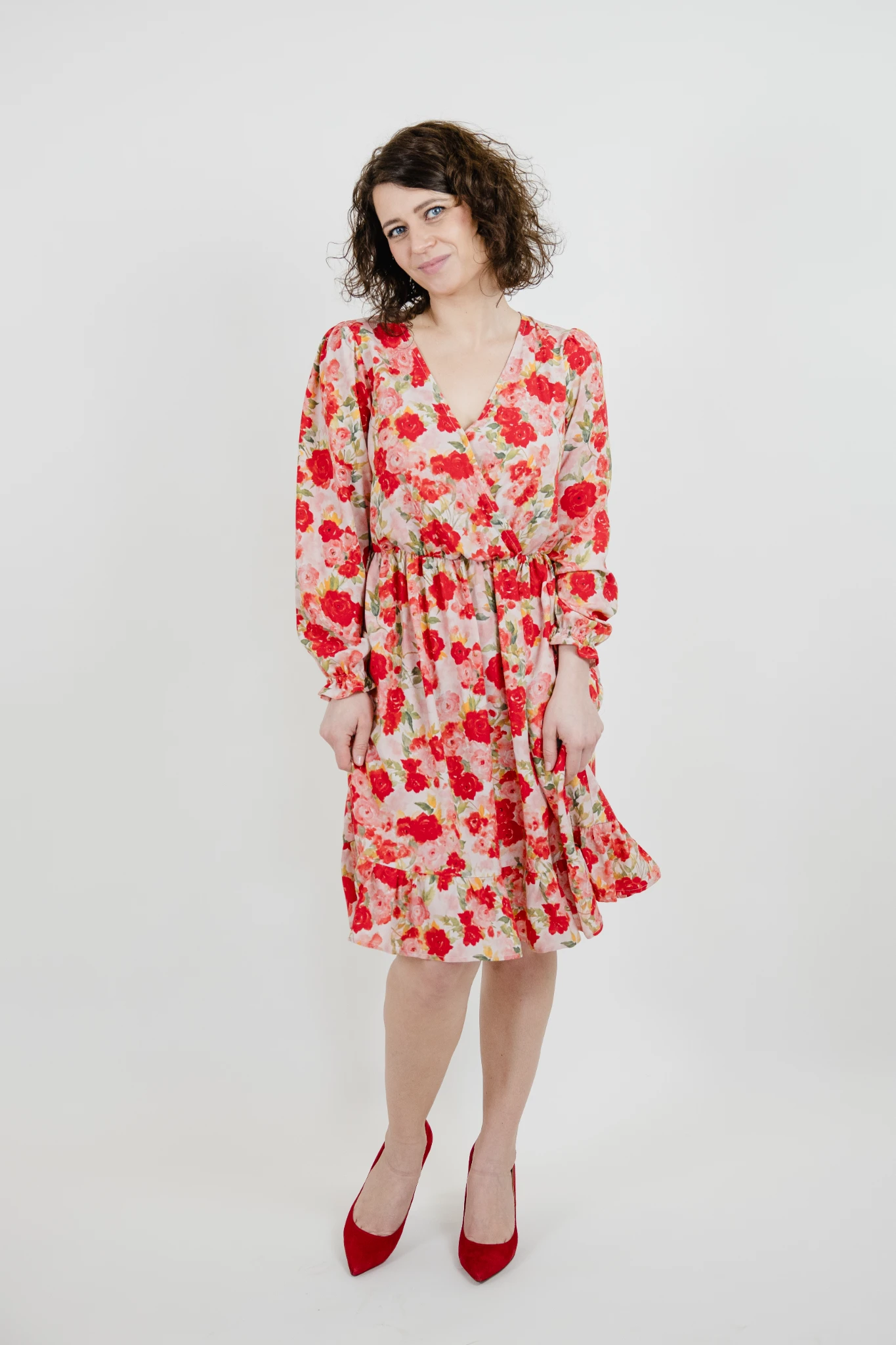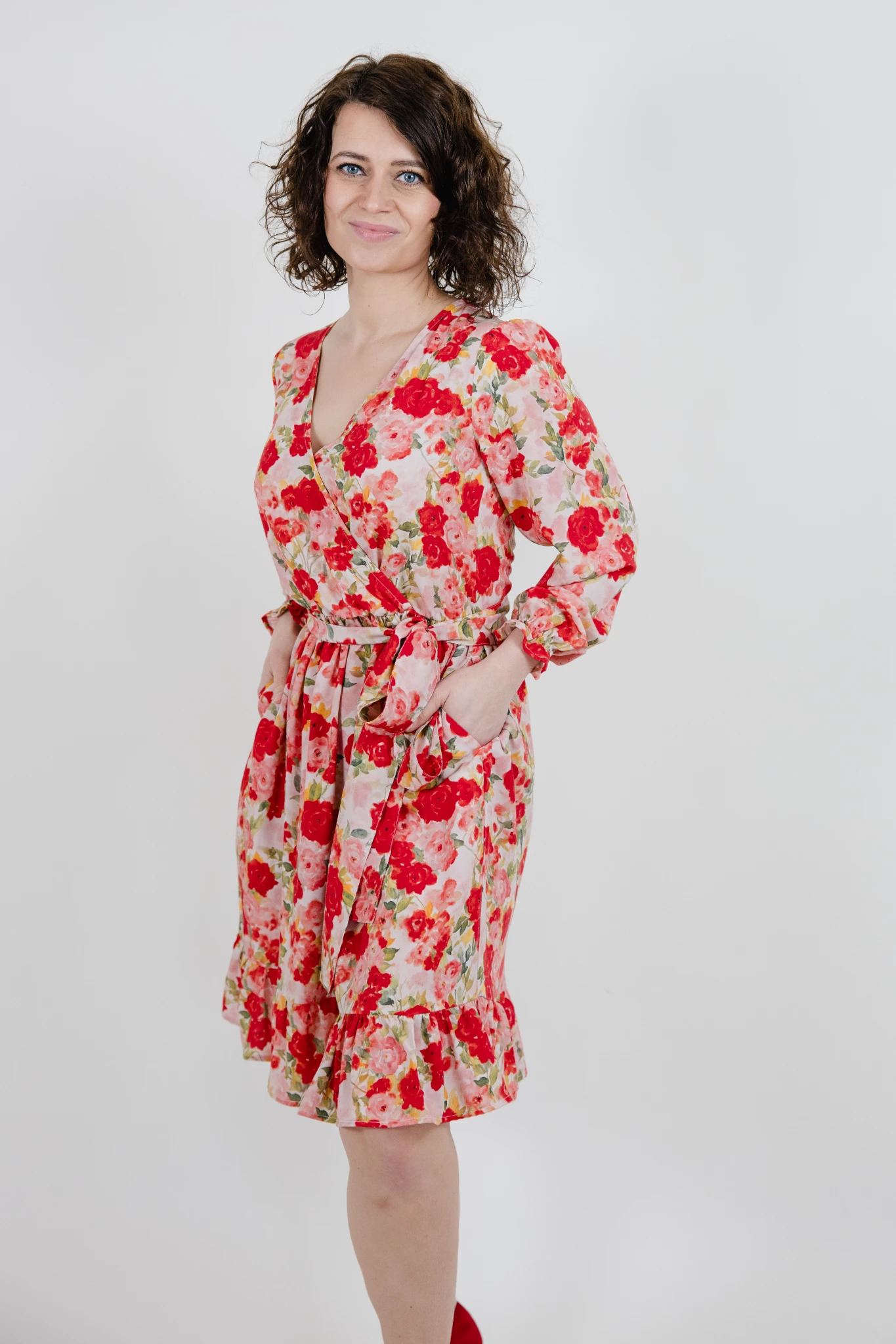 Kopertowa sukienka Claire, z długim rękawem zakończonym delikatną gumeczką i falbanką na mankiecie. Sukienka jest o długości przed kolano (w zależności od wzrostu), u dołu również sukienka ma falbankę. Sukienka w talii ma wszytą gumkę, a dodatkowo do sukienki jest także pasek – można go przewiązać z kokardą z tyłu lub z boku – według własnych preferencji. Użycie paska jest opcjonalne 🙂 Jak w każdej sukience mojej marki są głębokie kieszenie. Sukienka posiada zaszewki piersiowe, które powodują, że biust się mieści, a dekolt pięknie się układa i nie otwiera się.
