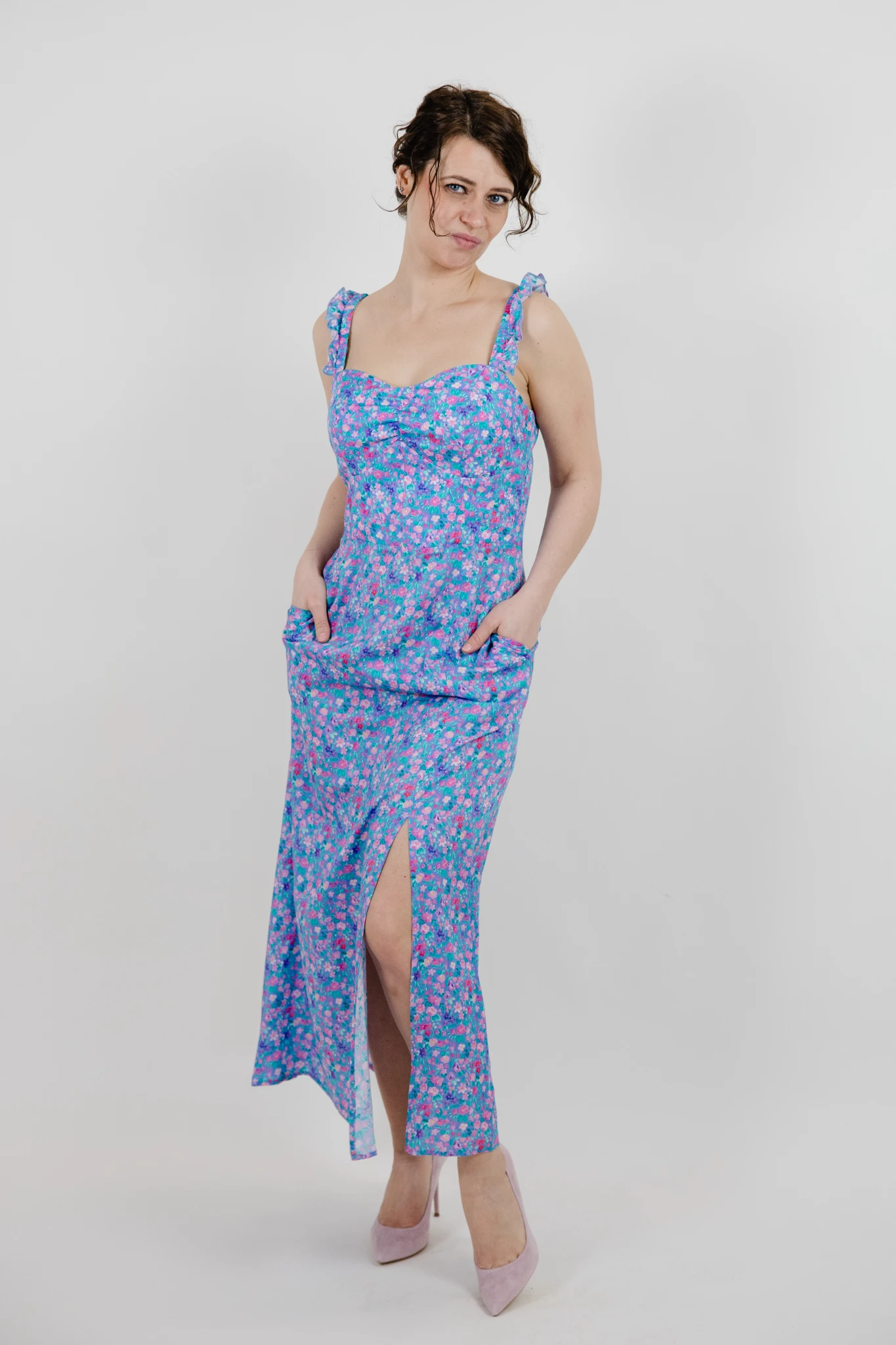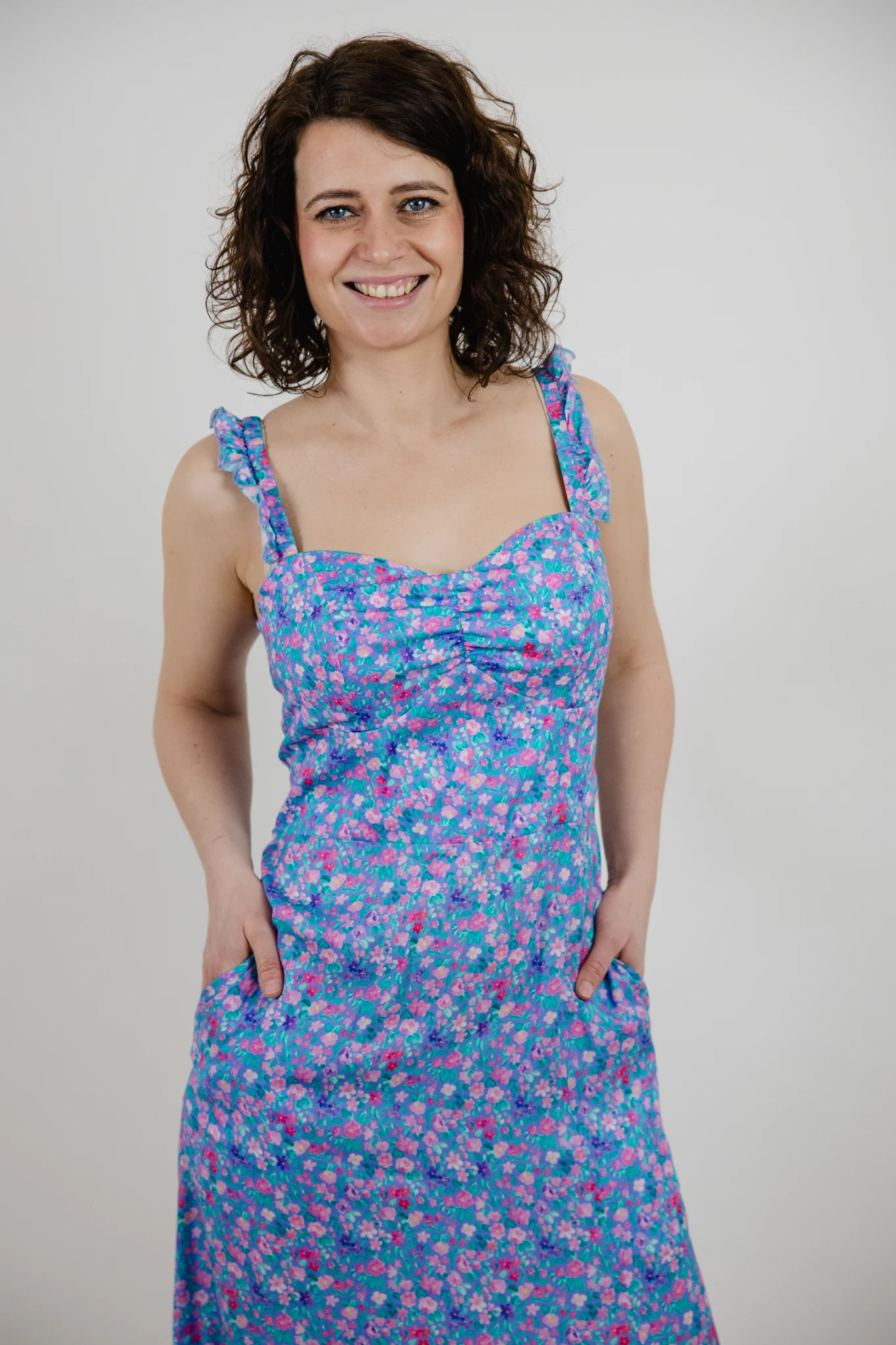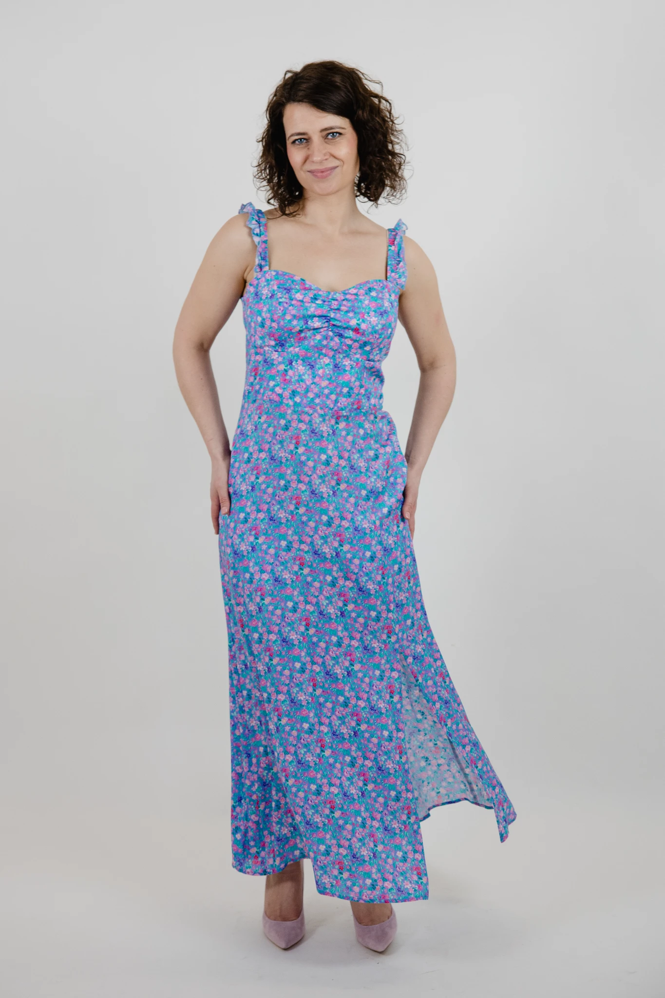 Lekka i romantyczna, kobieca sukienka z dziewczęcą nutką słodkości, pięknie układa się podczas chodzenia. Eloise to długa i zwiewna sukienka w drobne malowane kwiaty w kolorze fioletowym i różowym na fioletowym tle.